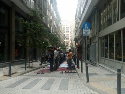 Στις φωτογραφίες που ανέβασε στο facebook ο Νάσος Γούτας φαίνεται μια πολυπληθής ομάδα μουσουλμάνων (πρόσφυγες; παράνομοι μετανάστες; ποιος ξέρει!) που συγκεντρώθηκε και προσευχήθηκε σήμερα το πρωί στο κέντρο της πόλης επί της Ηρώδου Αττικού με αφορμή τη μουσουλμανική γιορτή Κουρμπάν Μπαϊράμ.